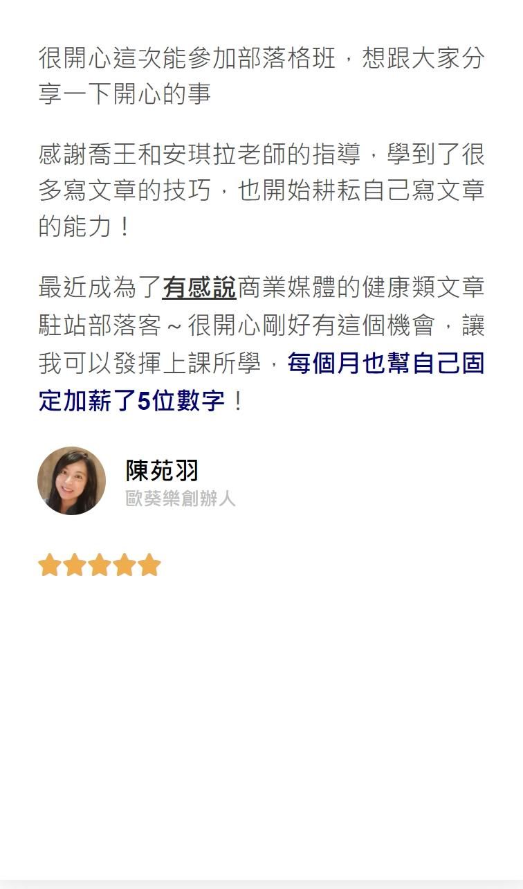 為了幫助更多人發展斜槓,不再被單一職業與單一收入限制,因而創辦了《斜槓槓槓槓》Podcast,並且開設部落格變現培訓班,輔導過上百位部落客打造個人品牌。