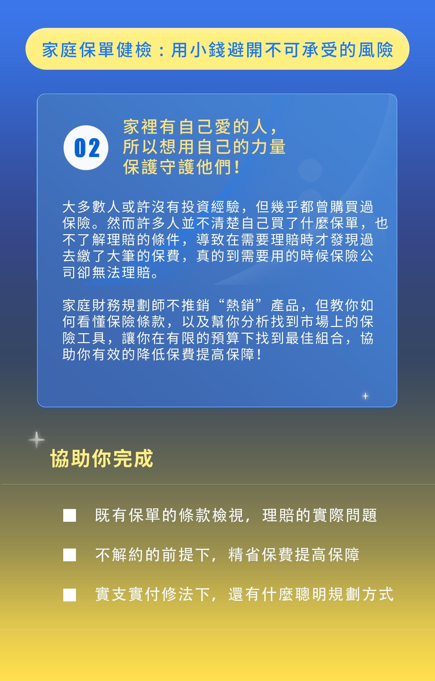 ・如平台指派規劃師不符合期待,經瞭解實際情況後可為你無償轉換家庭財務規劃師