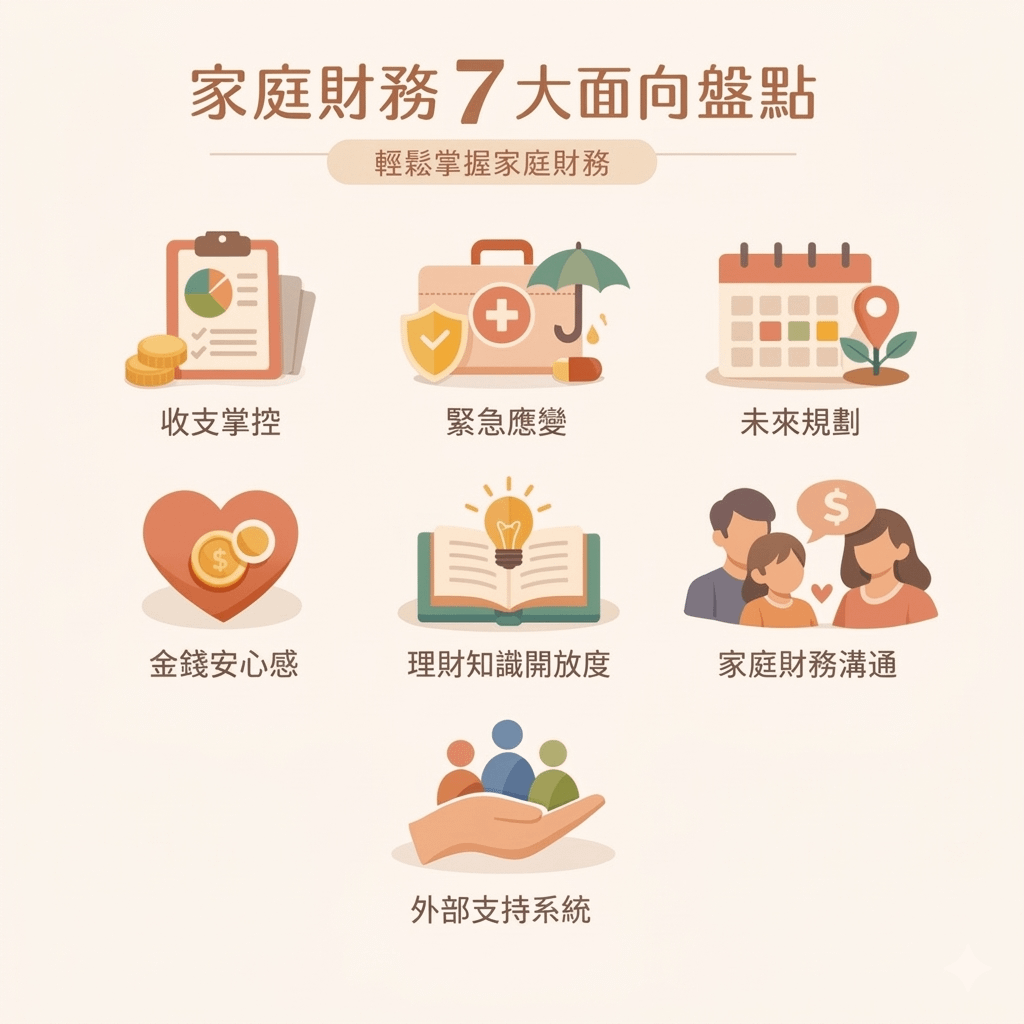 家庭財務安心健檢,不是完整的家庭財務分析報告。它是一個幫助你先盤點 7 大面向、看懂家庭財務安全度、釐清現況與優先方向的初階健檢服務。