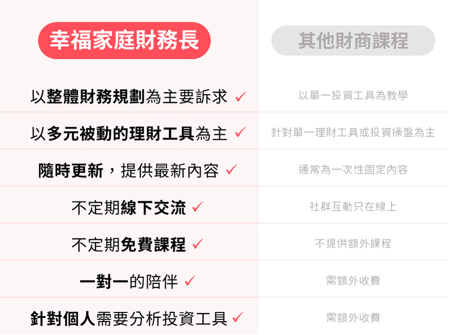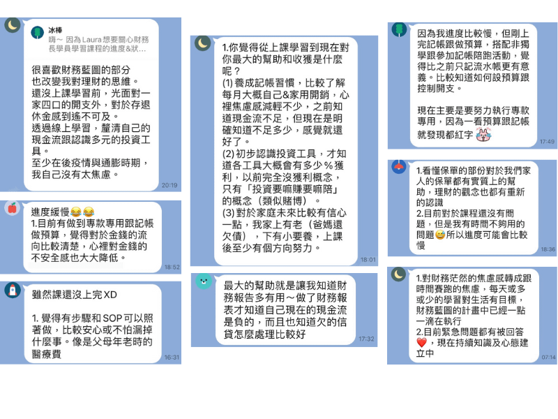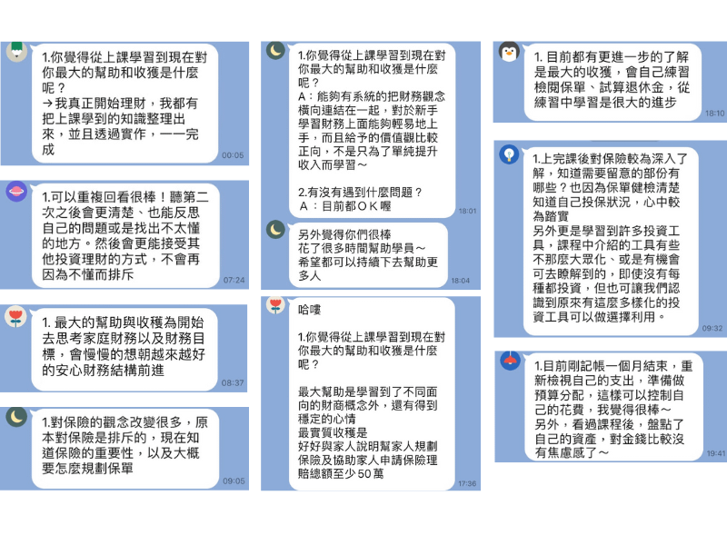 - 搭配一位理財規劃師,解決每一位學員在學習時遇到的問題。