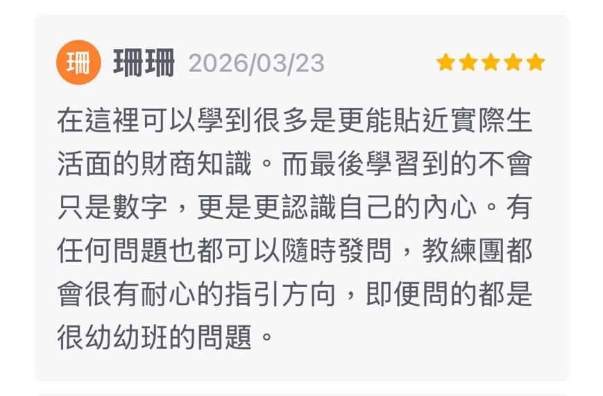 非常有幫助!這是實習教練培訓前的最佳入門課程。你可以體驗 MomPower 的陪伴模式、先把自己的財務打理好、了解教練是怎麼引導學員的,為未來的教練之路做準備。