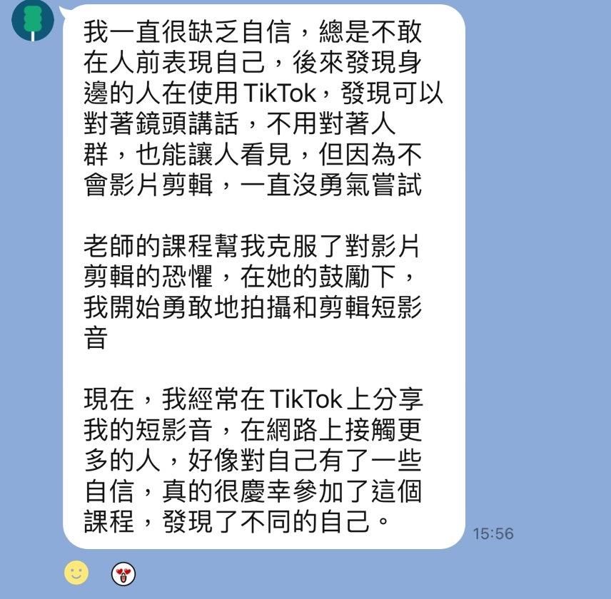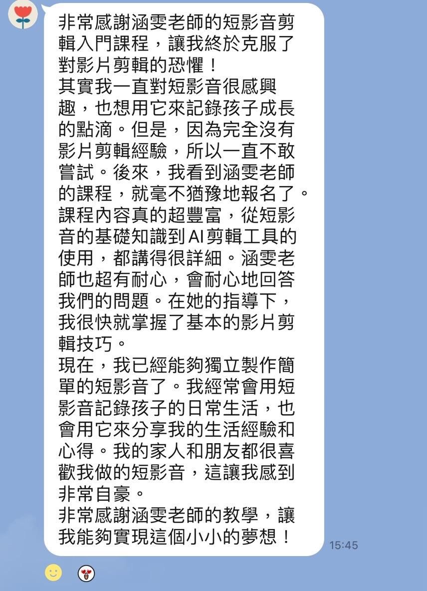 市面上短影音課程非常的多,但我深知媽媽們在學習上面臨的挑戰,所以選擇直播課而非錄影課,遇到問題馬上提問、課後討論社群、小組競賽練習、實習獎學金設置,都是其他課程無法取代的紮實經驗累積,讓付出的學費可以透過增進能力賺回來!