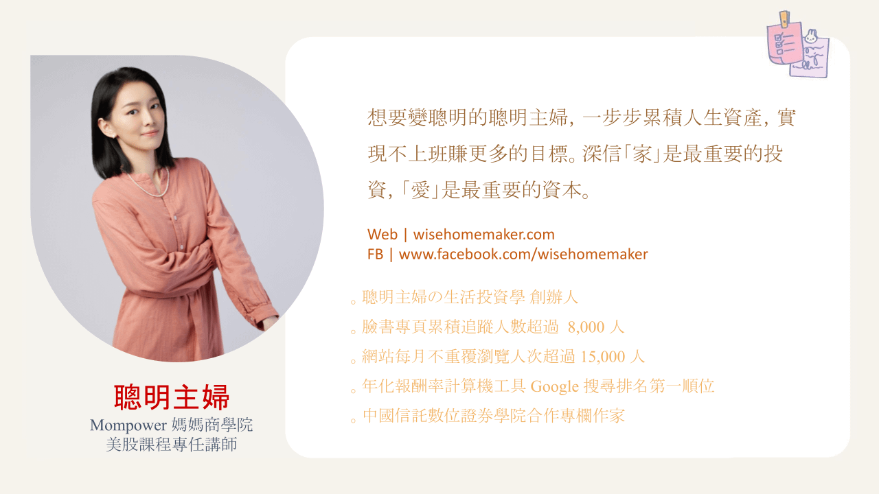 課程講師聰明主婦為長期投資的信奉者,從學習技術分析. 各類投資工具到市面各理財課程,以自身的經驗出發,擅長洞察與剖析人們的投資心理,讓投資理論不再難懂。