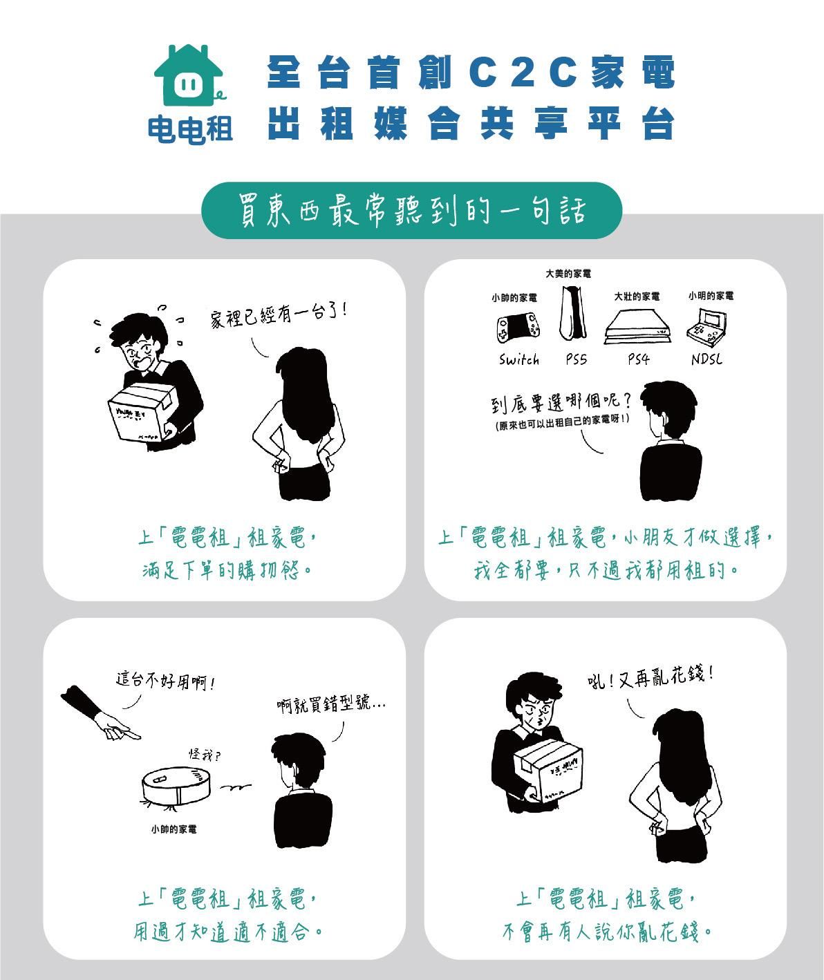 『電電租—全台首創C2C家電出租媒合共享平台』 提倡大眾「少用的家電 以租代買•常用的家電 試用後買」 全民都可以上架自己家中的閒置家電到平台上出租共享給需要的人,而需要的人能先用小錢體驗家電,以免買錯浪費。透過電電租平台線上預約租賃家電到線下進行租用體驗,結合在地社區據點推動家電出租,活化閒置資源,延長家電使用壽命,減少資源浪費,傳達物資需被充分愛惜與利用的價值,重建人們愛物惜物的簡約日常,持續創造循環經濟的永續生活風格。