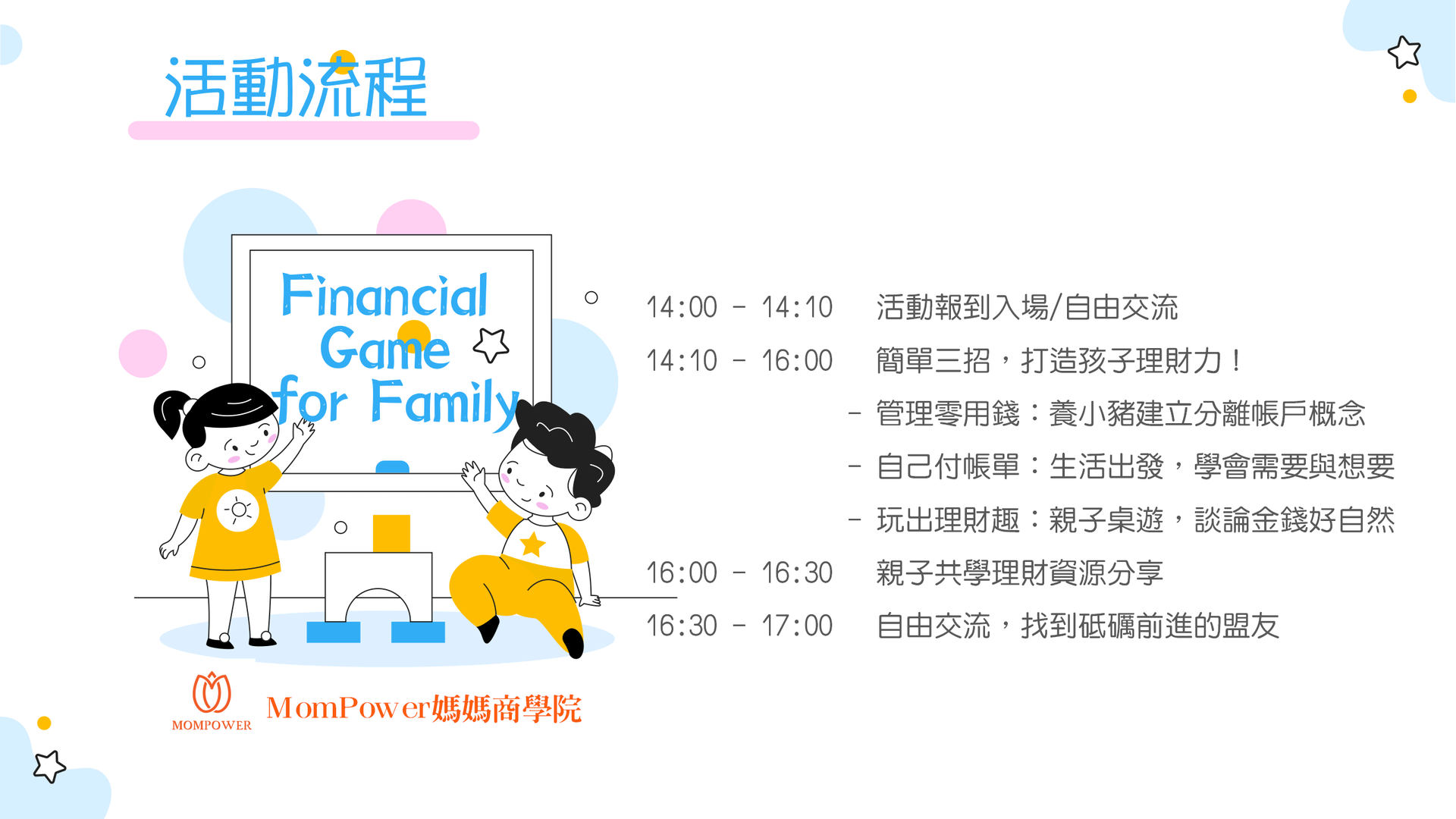 活動最後還會分享適合親子共學的理財資源,以及每雙週免費線上讀兒童財商好書社群,讓你回家後也能繼續探索親子共學理財。